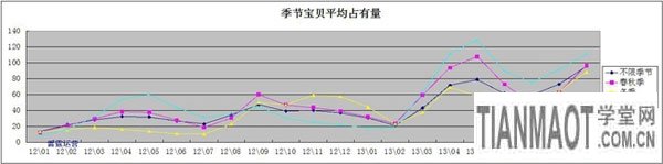 通過寶貝平均占有量發現,在季節這個屬性里,競爭都差不多。因此,選擇產品的時候,可以考慮以冬季為主推款,附帶銷售春秋季的。