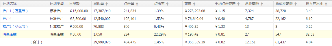 以上賬戶的計劃要是對兩個節日而言的。推廣1推廣的是當下熱門的萬圣節產品,推廣2則是為了下一個特別的節日——圣誕節做好前期的預熱培養。從數據上看,我們可以看到,推廣1的數據是比較好的,這個歸功于在萬圣節前夕進行的長達一個月的培養。而圣誕節相比下,ROI是很低的,因為不應季。而從整體的數據看,整個直通車的ROI效果還是相當不錯的。