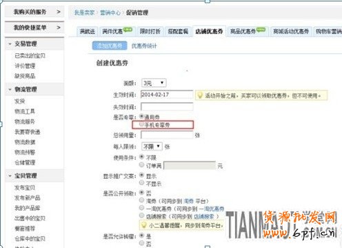 登陸自己PC店鋪后臺創建,點擊【促銷管理】——>選擇【店鋪優惠劵】,再進入優惠劵的設置,如下圖