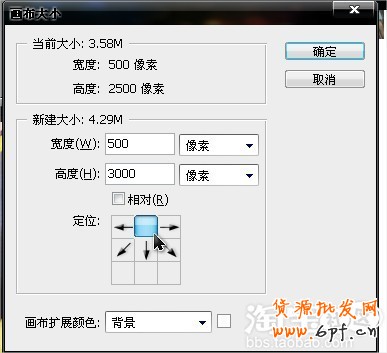 在這里面可任意調(diào)整畫布的寬、高,我把高度改為3000像素,注意一下定位,如果默認(rèn)中間定位,那么修改后的高度會(huì)上下同時(shí)增加,因?yàn)橹疤砑恿瞬簧賵D片,現(xiàn)在只是底部需要加長,所以定位的小方塊選擇在頂部。頂部不動(dòng),底部加長