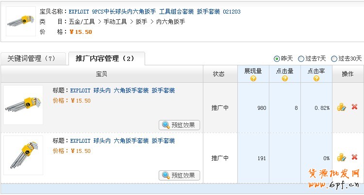 賣家在推廣中,利用最廣泛的就是直通車,而針對直通車推廣的產品,可以做兩個推廣內容管理。比如可以放兩張不同的圖片,然后針對該產品的大流量關鍵詞出適當的高價,讓這個產品在流量大的詞匯搜索中有一個好的展現位置,接著連續觀察兩天左右的時間,就可以判斷出圖片的優劣。如果圖片的點擊都不盡人意,那么可以做新的主圖再做對比分析。