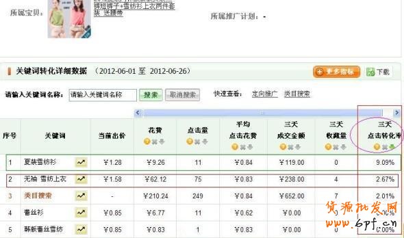 三天的轉化率從0%零雞蛋的轉化率猛升到2.54% 。轉化率從零到2.54%質的增長,充分說明了直通車關鍵詞的優化和關鍵詞費用調整優化對于轉化率的重要性。特別是在其他因素不便的情況下,優化關鍵詞的出價,能短時間內提升我們的轉化率。