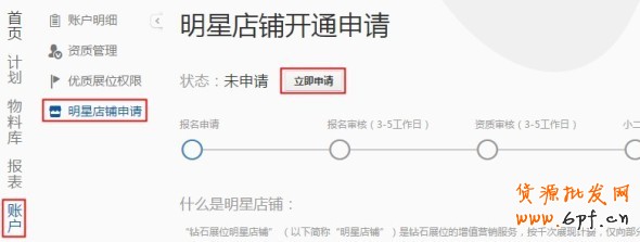 從我的推廣——鉆展進(jìn)入后臺(tái),點(diǎn)擊賬戶——明星店鋪申請(qǐng)——立即申請(qǐng)