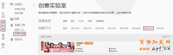 1、創意模板位于物料庫-> 創意工具 -> 創意實驗室 -> 選擇創意尺寸940×107,創意圖片尺寸大小:270×95