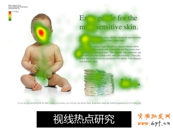 通過記錄統計發現,很遺憾,人們的目光都聚焦在了嬰兒的臉上(紅色位置為重點瀏覽位置)!對他們的產品賣點的關注可以忽略不計!可以說是個失敗的廣告。