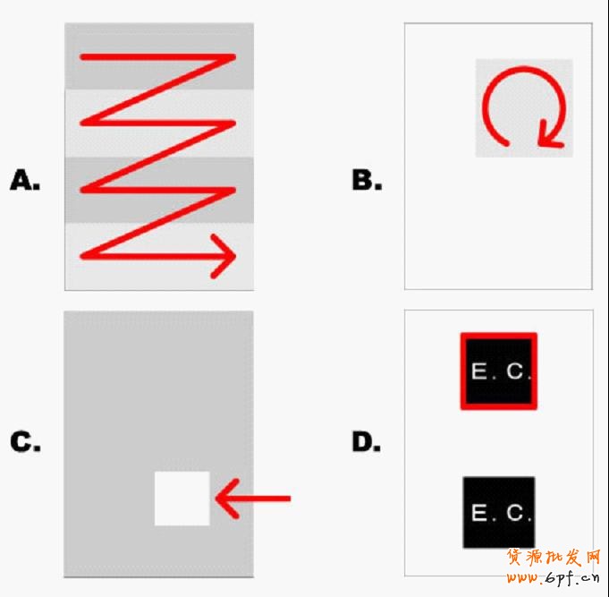B.在同一背景區域移動(在頁面某一部分明顯區別去其他部分的時候,人們會不斷的把視線集中在這,來回瀏覽。)