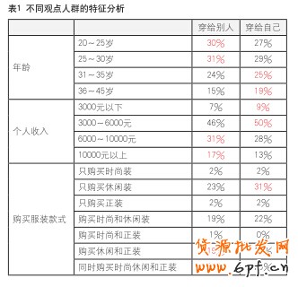 總體來看,對于穿衣的理念,消費者的觀點比較平均,52%的男性消費者認為衣服是穿給別人看的,48%的消費者認為衣服是穿給自己看的,穿給別人代表一種外向型的需求,而穿給自己代表一種內向型的需求。從兩類人群的特征來看,外向型需求的人群更加年輕,收入相對更高,購買的服裝款式也更多,有著更強的服裝消費需求和更大的消費力;而內向型需求的人群年紀較大,收入也相對較低,休閑裝就能很好地滿足他們的需要。(見表1)