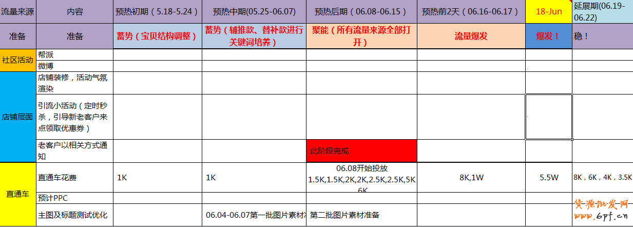 當然,這些都是基本功,靠平時積累的。那么流量獲取渠道具體是什么呢?   這樣的一個常規的投放是一般店鋪都具備的。常規的直通車,鉆展無線端投放。然后具體到哪一天具體投放多少。