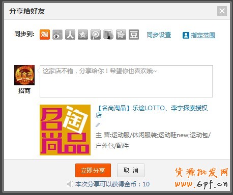 現(xiàn)在,“分享店鋪送金幣”和“分享寶貝送金幣”可以用起來(lái)啦~,讓買家?guī)湍惆训赇伔窒磉M(jìn)他的SNS網(wǎng)絡(luò),拉動(dòng)他人際網(wǎng)中的朋友來(lái)你店鋪逛逛、消費(fèi),相當(dāng)于熟客帶朋友的銷售模式啊~動(dòng)心不~
