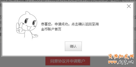 3、查看淘金幣賬戶協議,點擊【同意協議并申請賬戶】,提示申請成功,點擊【確認】