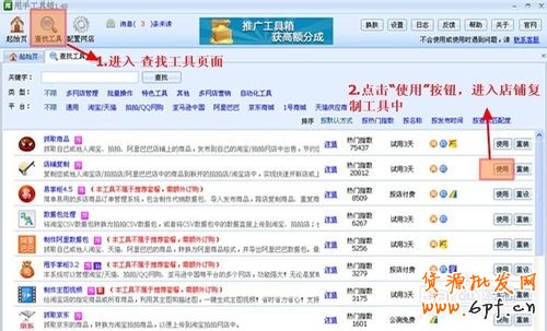2、在甩手工具箱查找工具頁面找到店鋪復(fù)制工具,點(diǎn)擊后面的立即使用,會進(jìn)入店鋪復(fù)制工具中,如圖所示: