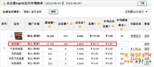 當(dāng)一款寶貝的總體點擊率很高,里面的所有關(guān)鍵詞質(zhì)量得分都很高。我用的方法是利用關(guān)鍵詞的點擊率,提升定向的質(zhì)量得分。下面看圖: