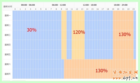 (1)周一到周五:00:00–8:30設為30%,09:30-10:30、11:30–13:30設為120%,14:00-19:30設為30%,19:30–23:30設為130%;