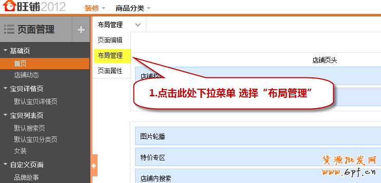 如何編輯旺鋪2012 的布局管理呢?進(jìn)入店鋪后臺(tái),選擇“布局管理”: