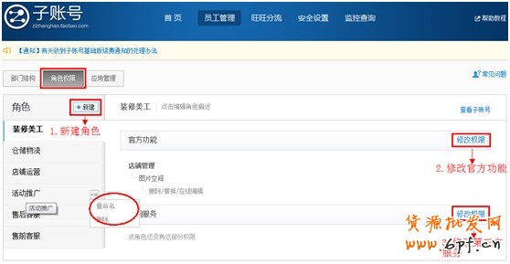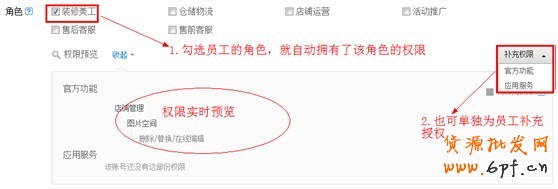 如圖6,根據(jù)店鋪里所有員工的工作職能,設(shè)置相應(yīng)的角色,比如客服、運(yùn)營(yíng)、美工、倉(cāng)儲(chǔ)等,并給角色授予不同的權(quán)限。