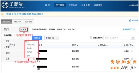如圖5,按照店鋪的部門結(jié)構(gòu),在子賬號(hào)后臺(tái)菜單員工管理>部門結(jié)構(gòu)中新建相應(yīng)的部門,例如客服部、財(cái)務(wù)部、運(yùn)營(yíng)部等。