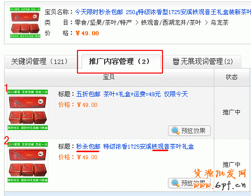 進入推廣寶貝頁面,就可以看到推廣內容管理,點擊進去就可以編輯,一定要設置好兩個推廣標題,標題一定要簡潔明了,突出重點。舉例:圖2的關鍵詞:“鐵觀音 秒殺 包郵”,都在上圖標題2(畫紅線處)出現,所以它的關鍵詞相關性就是好。