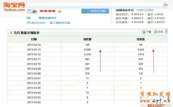 這個(gè)店鋪是一個(gè)4心小店,是3月5號(hào)正式接手過(guò)來(lái)操作的,大家看一下流量上升趨勢(shì),我在6號(hào)開始重新給店鋪內(nèi)的寶貝做了上架時(shí)間的規(guī)劃,我們?cè)賮?lái)看一下銷售總覽里的情況,過(guò)了一周后,在13號(hào)正好是一周后的時(shí)間,寶貝臨下架時(shí)間最近,當(dāng)天流量、訂單量都達(dá)到了最高峰。大家可能之前不太重視寶貝下架時(shí)間能給你店鋪帶來(lái)的流量變化,我再舉個(gè)例子,去年的雙十一大家應(yīng)該還有印象吧,我去年10月份做的汽車用品類目,是一個(gè)天貓店鋪,為了讓雙十一當(dāng)天盡可能的搶到流量,我提前一個(gè)星期把店鋪內(nèi)所有的寶貝都重新調(diào)整了寶貝上架時(shí)間,目的是讓所有的寶貝在雙十一當(dāng)天都臨近下架時(shí)間,所有雙十一當(dāng)天的流量翻了好幾倍