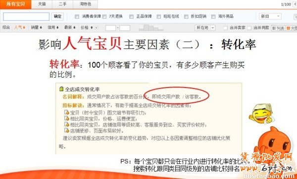 影響人氣寶貝的第二個(gè)因素,是寶貝的轉(zhuǎn)化率,這個(gè)轉(zhuǎn)化率怎么理解?也就是100個(gè)顧客看了你的寶貝,最終有多少個(gè)顧客產(chǎn)生了購(gòu)買的比例,在淘寶官方的定義是成交用戶數(shù)占訪客數(shù)的百分比,即成交用戶數(shù)/訪客數(shù),淘