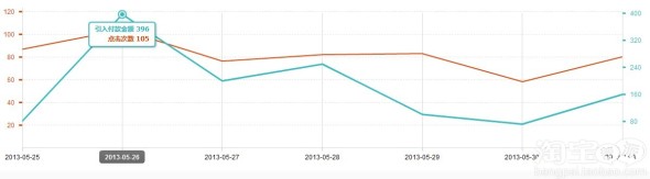 這邊可以看到最高的點一天點擊數(shù)是105,引入的付款金額是396元,那么平均的轉(zhuǎn)化率是6.06%