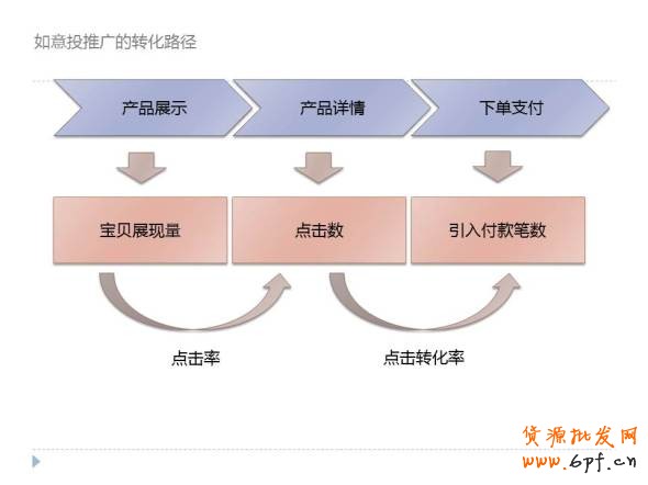 1.首先我們看下如意投的轉(zhuǎn)化路徑 如意投的轉(zhuǎn)化包含三個(gè)節(jié)點(diǎn),產(chǎn)品展示(曝光)、產(chǎn)品詳情(跳轉(zhuǎn)到店鋪的寶貝頁(yè)面)、下單支付。這些數(shù)據(jù)在如意投報(bào)表中都有統(tǒng)計(jì),產(chǎn)品展示對(duì)應(yīng)寶貝展現(xiàn)量(流量),賣家點(diǎn)擊(點(diǎn)擊數(shù))后到達(dá)寶貝詳情頁(yè)面,點(diǎn)擊購(gòu)買(mǎi)進(jìn)入購(gòu)買(mǎi)支付流程。如圖: