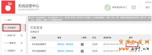Step1.打開無線運營中心(wuxian.taobao.com),點擊無線裝修——店鋪首頁——手機淘寶店鋪首頁——去裝修;