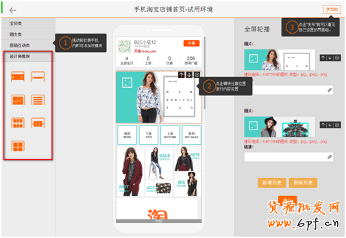 Step4.進入試用環境后,可自由調整模塊順序、寶貝排列,方法與無線店鋪裝修一致,“設計師模塊”為該模板自帶模塊,商家購買后即可使用;