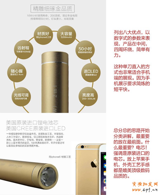 2、寶貝的亮點剖析(展示寶貝有點,全網塑料移動電源PK金屬外殼);