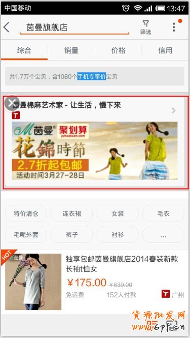m.taobao.com觸屏版,搜索結(jié)果頁(yè)第一個(gè)位置,如示意圖所示。