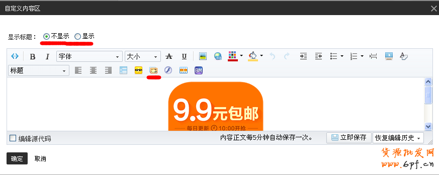 添加成功后對添加的自定義區進行編輯,如下圖操作,首先在顯示標題欄:不顯示(選擇這個是為了美觀),點擊下方紅線標記的圖片按鈕,添加我們剛才下載的圖片,添加完畢后跟下圖一致,并且我們讓它居中對齊