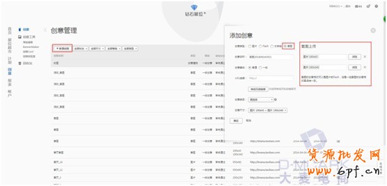 該展位添加創意的方式與其他展位添加創意有所不同,進入添加創意界面后,在創意類型處找到套圖,點擊進入套圖界面,填寫創意信息和填寫圖片創意的步驟是一樣的,區別之處是上傳圖片時需要同時上傳兩張圖片,而且每次就只能上傳一個套圖,目前還沒開放批量上傳功能,套圖上傳完畢及審核通過后,我們就可以對套圖進行投放了。如圖3: