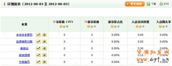 訪客分析提供各來(lái)源的訪客數(shù),新訪客數(shù),新訪客占比,入店訪問(wèn)深度,入店跳失率5大訪客指標(biāo)。真正檢測(cè)各來(lái)源的引流功力。