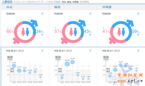 根據(jù)淘寶數(shù)據(jù)的反饋,現(xiàn)在沖鋒服的消費(fèi)人群比較廣,從18歲到34歲分布比較平均,睡袋集中在25到34歲,而風(fēng)衣的消費(fèi)年齡明顯的偏小,容易被年輕用戶接受。