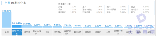 以下是淘寶上與戶外有關(guān)的類目市場(chǎng)分布情況。可以看到,戶外風(fēng)衣、速干褲、登山鞋、包袋、速干T恤、露營(yíng)物品和沖鋒衣褲這幾大分類占據(jù)著戶外產(chǎn)品超過(guò)1半的市場(chǎng)。