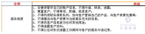 ⑤淘寶客服注意事項:主要分為服務制度,日常行為規(guī)范,客服必學技巧。服務制度主要涉及到旺旺賬號密碼的保密,客戶資料的保密,尊重客戶,不得利用職務謀取私利等。日常行為規(guī)范主要涉及到遵守公司規(guī)章制度,熱情樂觀服務客戶,必須有責任心,多學多問等??头貙W技巧主要涉及到清潔電腦,設置電腦,規(guī)范電腦使用習慣,工作做好交接,客戶按照等待時間回復,及時更新快捷回復和自動回復,學會登記客戶需求等。例如: