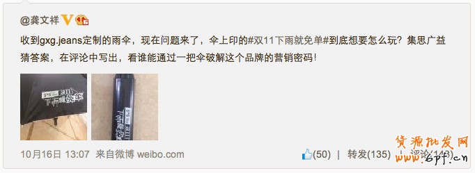 步驟一:10月16日,聯(lián)合龔文祥、魯振旺、吳蚊米、魯國平等電商大V微博曬傘,傘上除了“gxg.jeans雙十一下雨就免單”外,無任何信息,引起業(yè)內(nèi)首波疑問。