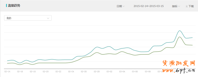 通過流量趨勢圖,從2月24號開始,店鋪流量逐漸攀升。2/14~3/15,鉆展占到店鋪整體流量的71%左右,由于春節的關系正月初八店鋪才恢復上新。