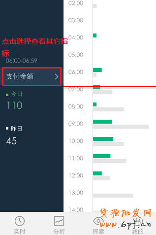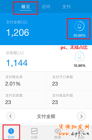 實時展現當日的支付金額、訪客數、支付轉化率、支付子訂單數、支付買家數、支付商品件數,讓您能實時關注店鋪核心數據的變化;并且,支付金額和訪客數還能實時查看PC、無線的占比變化。