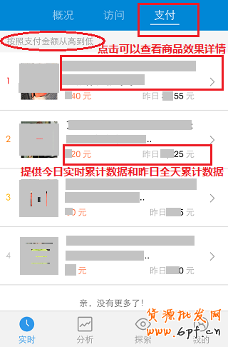 1、實時查看今日商品TOP50瀏覽榜,并提供今日實時累計支付金額和昨日全天累計支付金額;點擊單個商品可查看有關該商品效果詳情數據;
