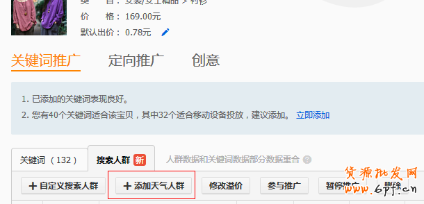首先,我在一款長袖襯衫上進行了測試,該款寶貝流量比較穩定,類目標簽和天氣標簽我都進行了嘗試。第一天我在天氣的標簽選擇上多選了幾個選項,溫度上我選擇了涼爽和舒適,天氣現象上選擇了晴、多云,陰、陣雨,空氣質量上選擇了優和良,覆蓋人數也很廣,達到了102300人,擴大了人群范疇,也就更容易引進流量,先試下水,在出價上,我也先保守地寫了1%。