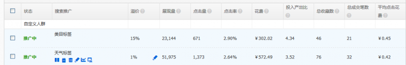 一天測試下來,發現天氣標簽因為覆蓋的人群較廣,雖然出價低,但是還是流量挺大的,一天引進了204個流量,點擊率也挺好的,為1.28%,轉化效果也好,ROI在4.58,PPC也還可以,在0.56。而類目標簽,測試下來,流量不大,可能也是因為我選擇覆蓋的人群較狹隘,覆蓋的人群較小,所以流量不大,就引進了2個流量,也沒有帶來成交。