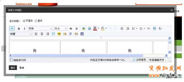 10.全選復制,來到店鋪裝修,添加一個自定義,點擊編輯,不顯示,點擊源碼,把框架代碼粘貼進來,再點擊源碼,框架就出來了