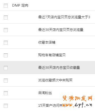 DMP定向可以根據官方總結出的類目點擊率高的人群創建,進行測試投放。比如“瀏覽收藏頻次中未購買”、“最近7天店內寶貝頁總瀏覽量”、“最近30天店內寶貝頁總收藏量”等人群。