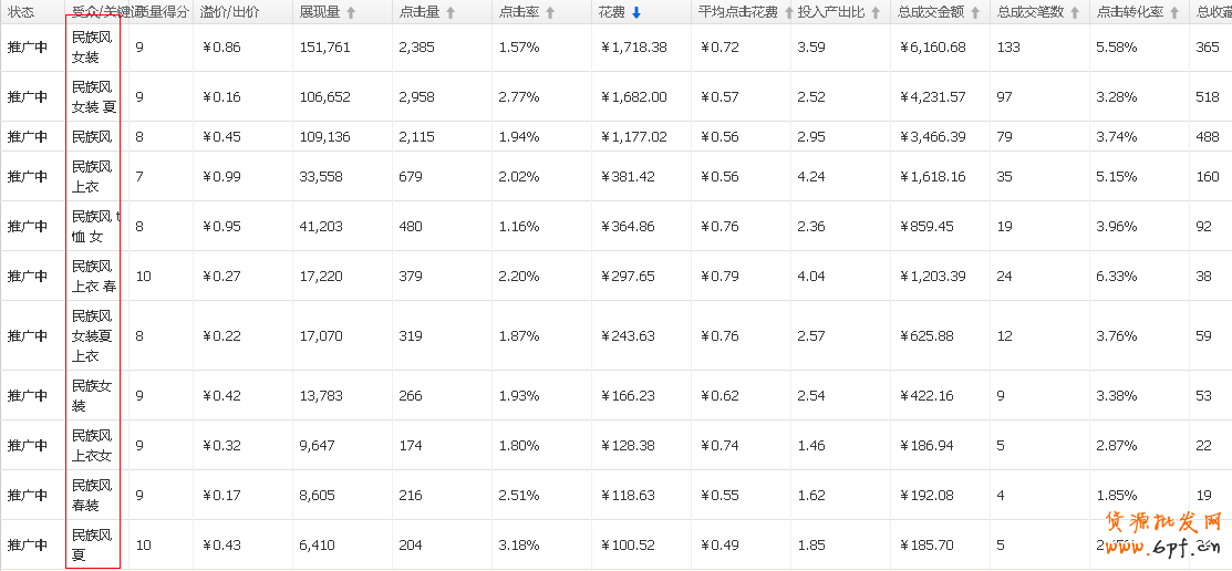 數據分析:從以上數據可以看出,寶貝有轉化的關鍵詞都和一個特性有關——民族風,這就說明賬戶在轉化的過程中主要還是靠的是精準關鍵詞的轉化,同時像這種寶貝本身風格特性十分明顯的,它的轉化一大部分就是風格的關鍵詞,所以像這樣的店鋪在關鍵詞推廣的時候就可以重點做精準關鍵詞的優化。