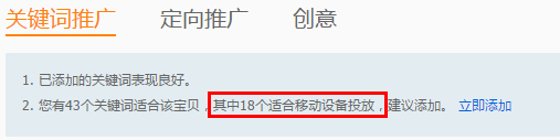 注意不是移動包就是你的無線詞哦,同樣需要選擇手機標的,關鍵詞推廣下方有時也會有提醒(如下圖),不過系統會根據店鋪的情況推薦。
