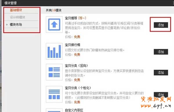 2.在模塊管理中的基礎(chǔ)模塊里選擇自己需要的模塊,點擊“添加”,模塊管理中有三個部分,分別是:基礎(chǔ)模塊、設(shè)計師模塊、模塊市場,模塊市場中的模塊是需要錢的,而基礎(chǔ)模塊就是免費的。