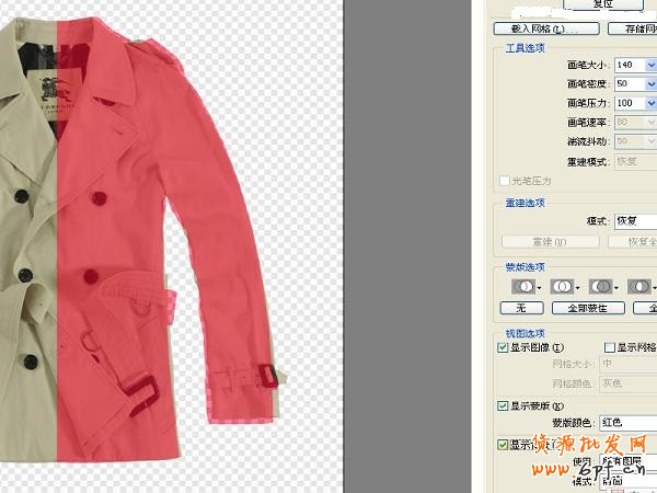 液化紅色的那半在上一圖層眼睛不關(guān)然后在下面衣服上液化,液化時選擇顯示背景。