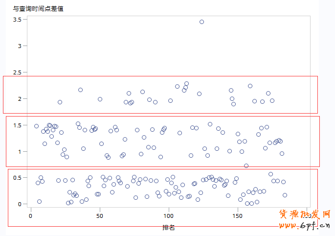 這邊縱坐標的1,已經是代表了1天,因為這個詞的寶貝數比較少,已經不能把日期看做一個離群值來考慮了??梢钥吹剑@邊明顯分為3個層級,在一天到一天半之內的時間,也是可以上首頁的,那我們是否也可以考慮,把這三個層級分下,看看具體他們寶貝有什么區別,也可以作為我們排名靠前該怎么做的一個依據。
