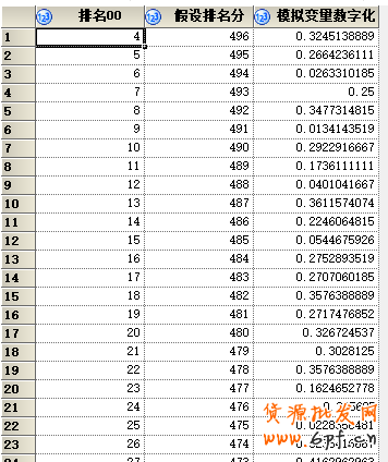這個就是我剛剛弄好的兩個變量,其中假設排名分,就是設的一個根據排名越高,給分越高的一個設定,在這個分析中,并沒有什么作用,大家不必去在意。然后,需要做一個初步判斷,最簡單的方法,就是作圖,直觀,簡單,能看出很多東西。我先做了一個散點圖,看看分布。