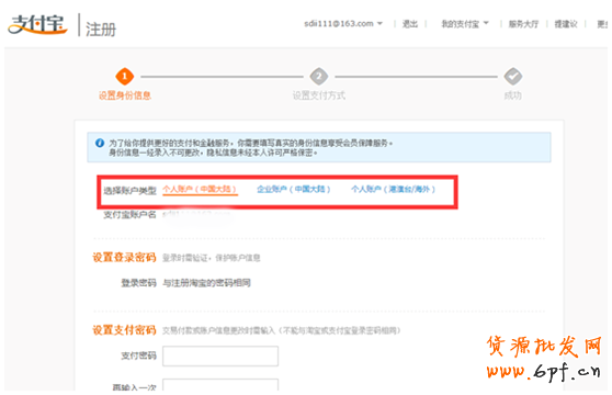 二、下圖為支付寶認證頁面,區別個人店鋪和企業店鋪之一,如果是開個人店鋪,選擇賬戶類型的時候則點擊個人賬戶(中國大陸);如果是港澳臺同胞,則選擇第三個;如果是開企業店鋪,選擇第二個企業賬戶(中國大陸)后面將會講解開企業店鋪所用到的材料。